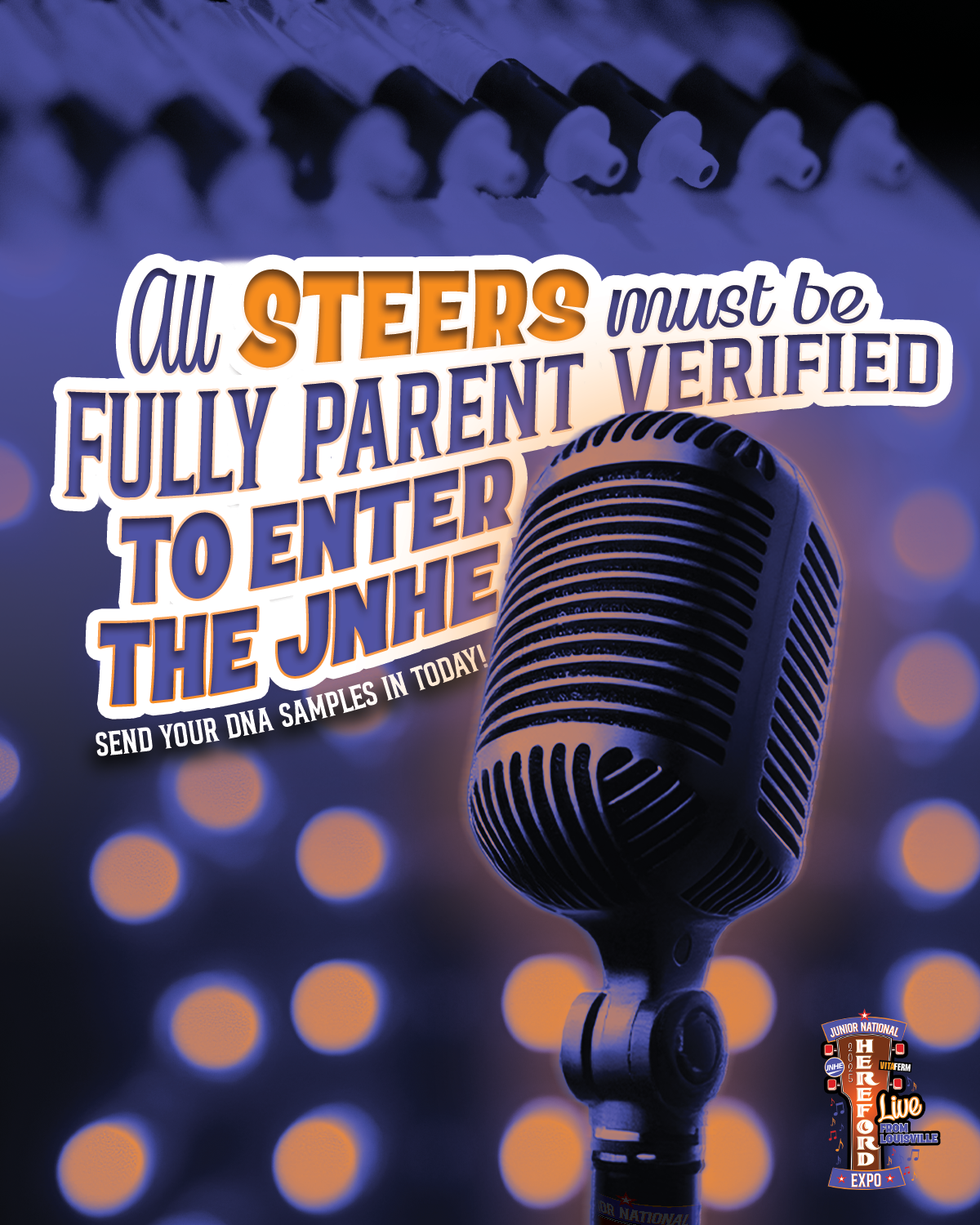 The 2025 VitaFerm® JNHE reminds steer exhibitors that all steers will be required to be parent verified to both sire and dam, therefore, a DNA profile of the steer, the sire and dam must be completed through the official AHA lab by entry deadline. DNA requests can be made through MyHerd, by emailing aha@hereford.org, or by calling customer service at (816) 842-3757.