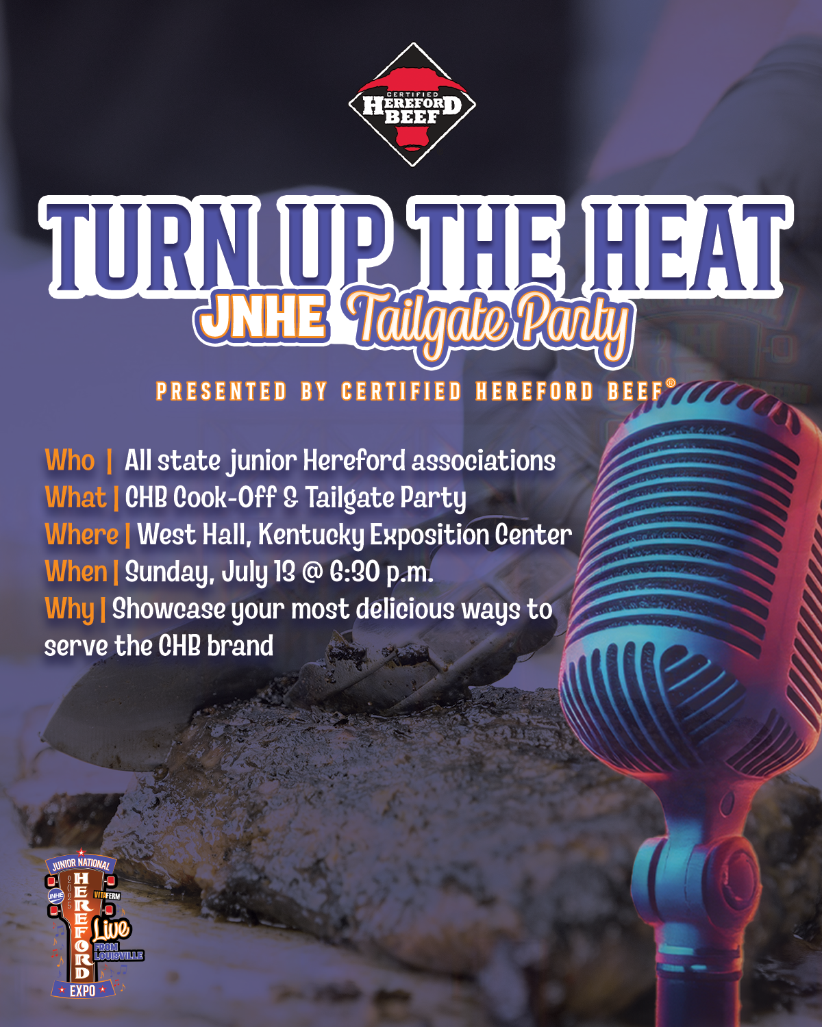Hey junior Hereford associations — it’s time to rally your teams and bring your A-game to the most mouthwatering event of the summer. We're turning up the heat at this year's JNHE Tailgate Party, and thanks to our amazing friends at Certified Hereford Beef® (CHB), your state gets to show off its best beef-cooking skills in a live CHB Cook-Off.